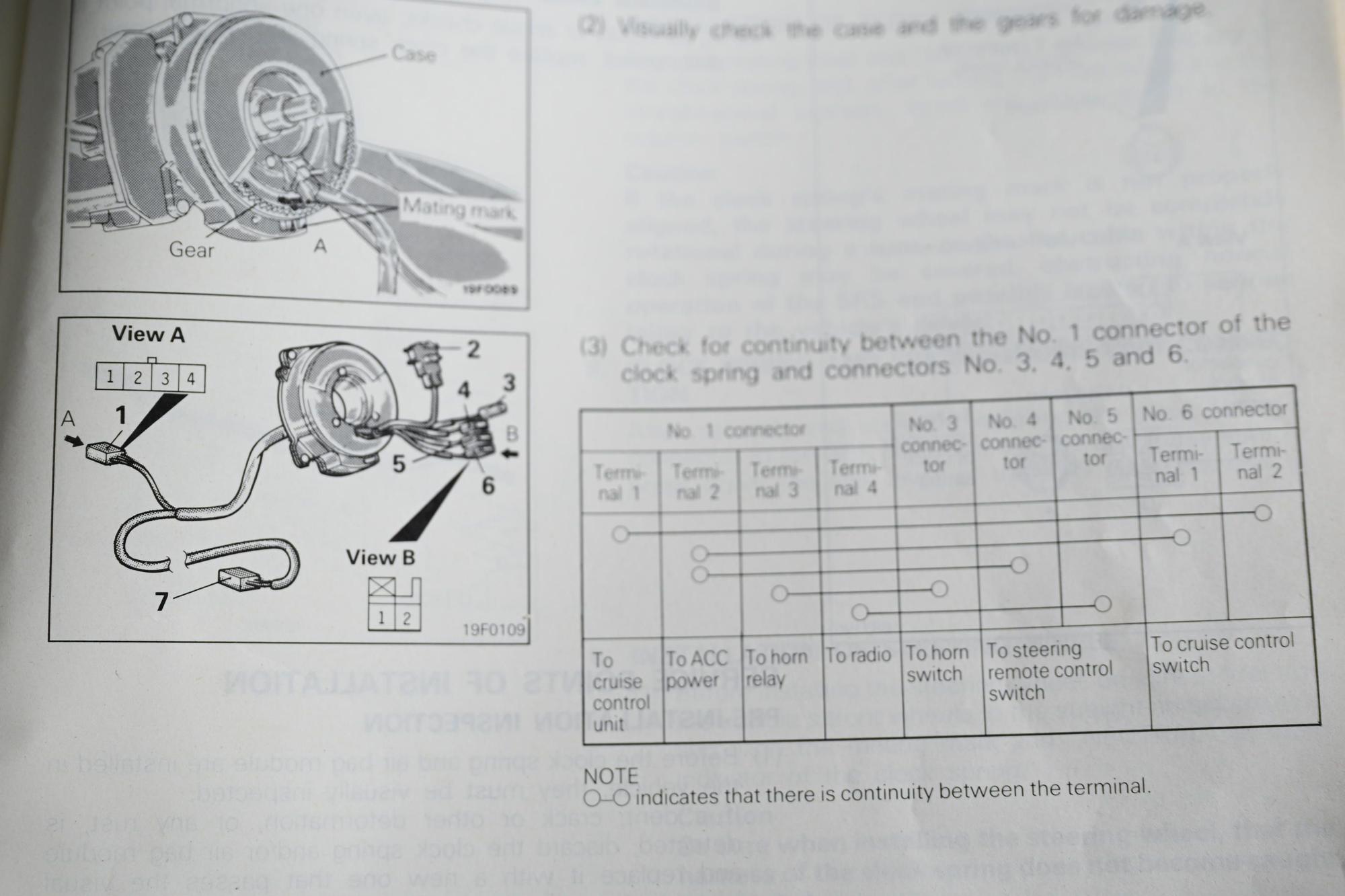 The first one is: I've had an SRS light on for some time now, so I've decided to see if I can figure it out. Looking at the picture from the service manual, can anyone tell me where the number 1 connector is (View A)? I've pulled the side panel showing the red shielding going back to the ECU, but I can't find the 4-pin flat connector (View A). I've also dropped the bottom cover on the clock spring, and can't see it under there either.