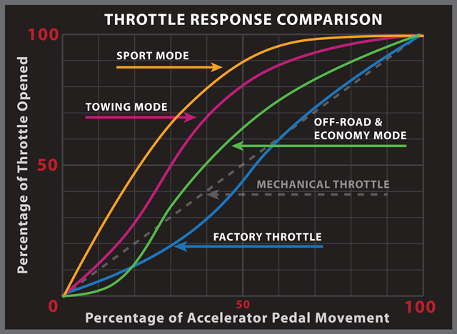 Today I've installed the Pedal Commander. The throttle lag has always driven me nuts on vehicles with electronic throttles, the D is definitely one of these. The last time I looked into devices to fix the was back in 2009 for the '08 RAV4 I owned. Back then Blitz Racing made one for the Japanese RAV4 and I thought of getting it, but back then it cost around $750-800 so I never took the leap. Recently I heard of Pedal Commander making them for the D and the price is more reasonable now. Of course the issue isn't the throttle, it's the programming for the response. However, even looking at Pedal Commander's site, their illustrations don't show the actual cause of the issue well. The issue is the throttle curve that's programmed. Here's a couple illustrations from a couple other brands that show some typical factory throttle curves pretty well: