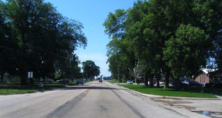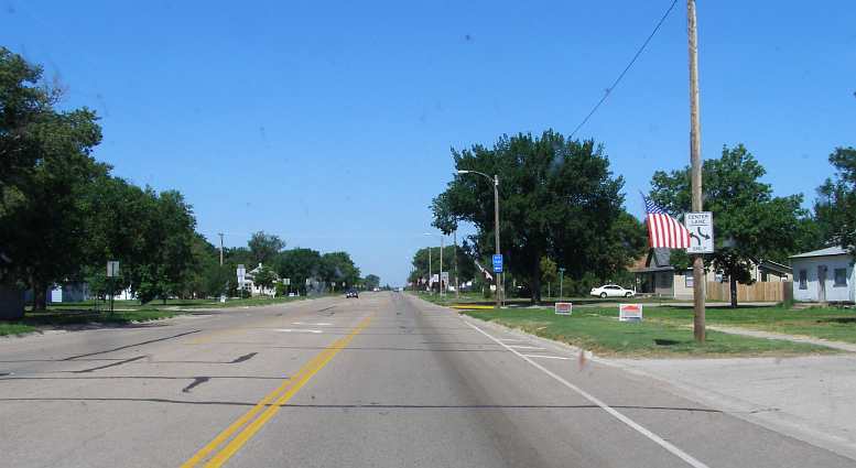 Turning West. The wide street out of Arapahoe still has flags out from July 4 as it started me heading West again.