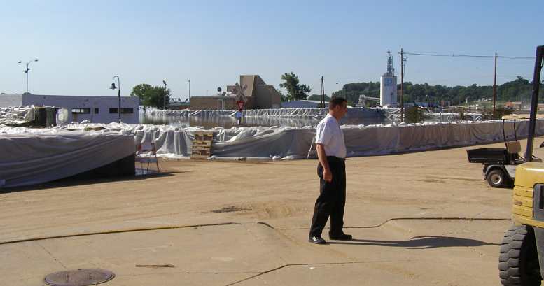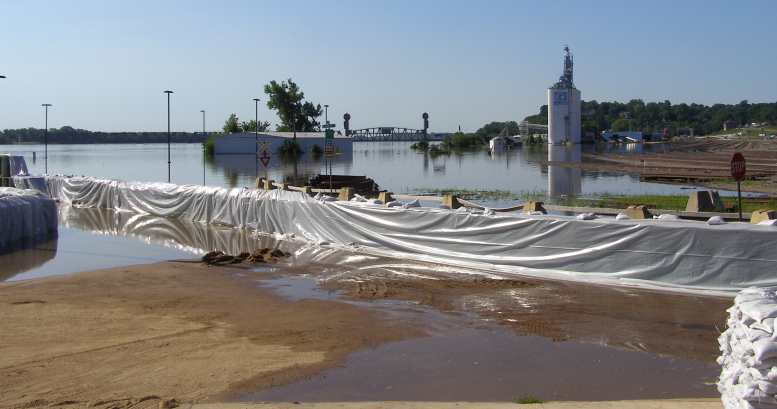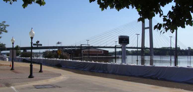 Eager to see what was going on along the Iowa foreshores of the river I drove down to where teams were sandbagging to protect low-lying parts of the town. Already a restaurant and other buildings were inundated and cut off from dry ground, while railway lines also ran into the river.