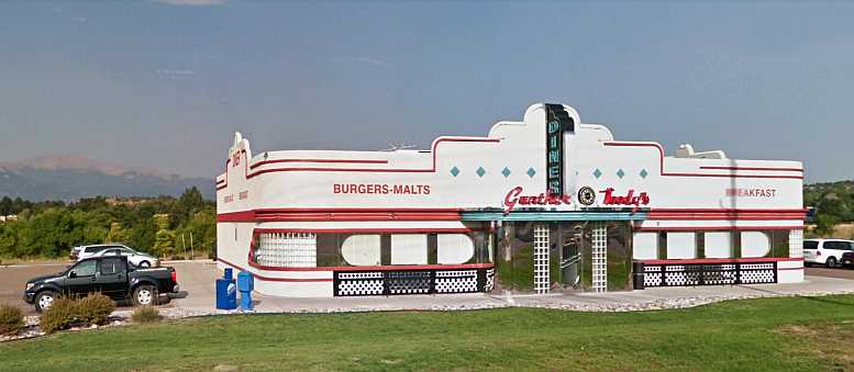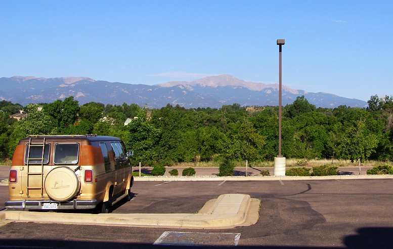 Pikes Peak in view. The van in the carpark at the rear of the diner. Pikes Peak dominating the skyline.