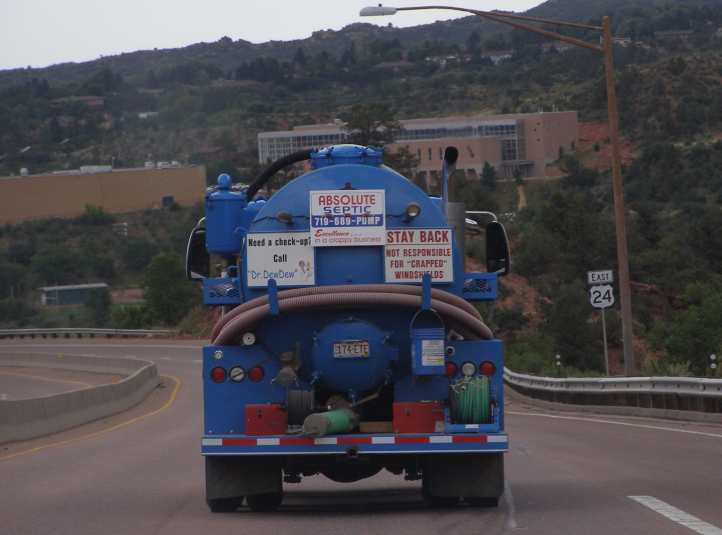 During that drive down from Pikes Peak I spotted yet another sullage removal truck, not one operating on Pikes Peak, and which I photographed for Sue at home. Sue operates such a truck, though she doesn't do the dirty work herself, her truck also has amusing signs on the back. Then I returned the rented Camry and once again boarded the van for the trip North.
