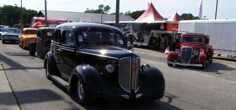 Driving around. And endless stream of cars drove round and round the Fairgrounds, this ’38 Dodge is ahead of a highly rodded Dodge pickup, a Ford Custom and a ’64 Plymouth.