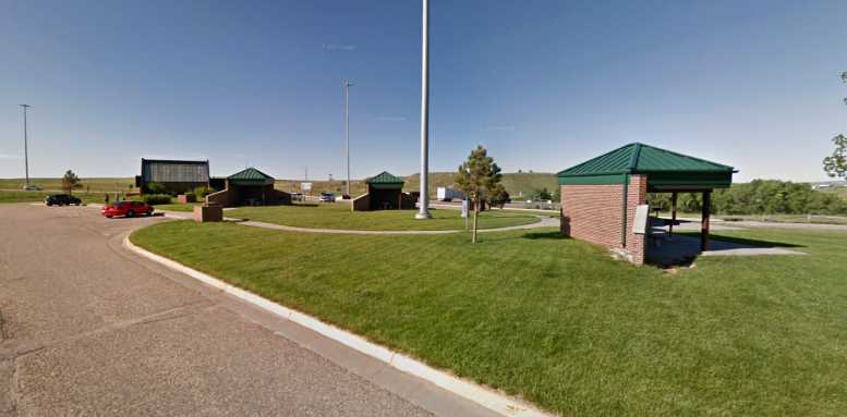 Orin Junction Rest Area. The hilltop location makes it a good spot to pick up prevailing winds, the picnic tables are therefore well-protected by those brick walls.