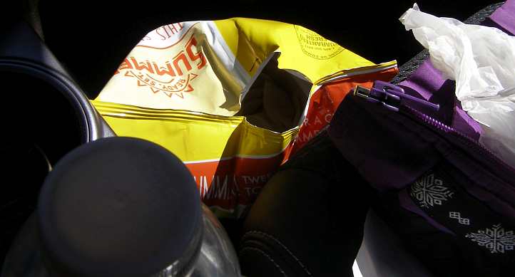 Chips opened! In my case, even the chips knew we were climbing! Note also the heavy jacket I took with me on this bright and sunny day.