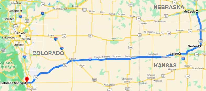 At McCook I would have to swing South to get into Kansas and began the final run-in to Colorado Springs and Pikes Peak…