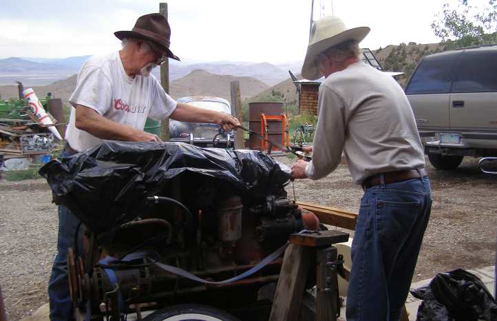Wrapping the 413. Tom and his friend re-wrap the big old 413ci Dodge truck engine I’d come to see. In the background was the Porsche 356, just one of the interesting things he had taken up his driveway over the years.