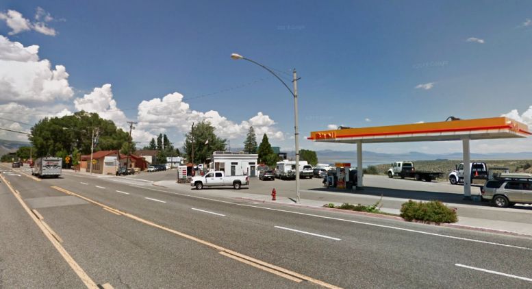 Shell at Lee Vining. Such is the nature of the area that the Shell station, who were nice enough to lend me a can to put some fuel in, has a view of Mono Lake.(GE)