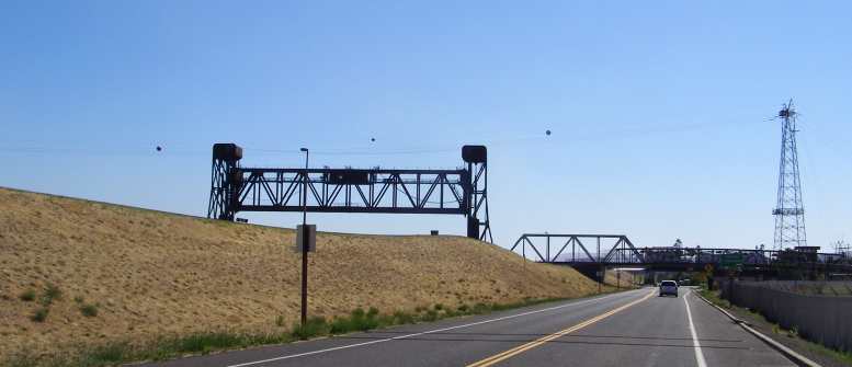 Lewiston levees. Levee banks indicate that Lewiston sometimes has to live through floods, while the opening span on the old bridge shows that there’s traffic on the river too.