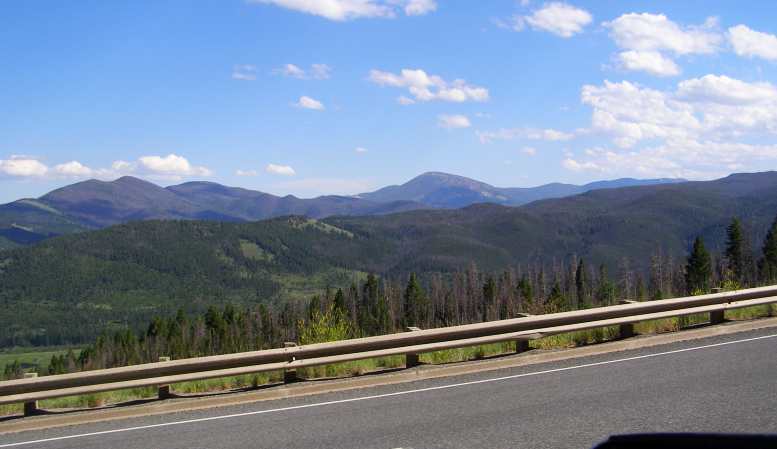 Finally, several miles into the climb, I rounded a tight corner and saw a very slow truck ahead. The poor pickup wouldn't survive if I had to slow any more, there was too little airflow through the radiator anyway, so I pulled up in a bit of a flat area on the side of the road. There I waited while the temperature dropped. Fortunately I didn't lose any water in all of this.