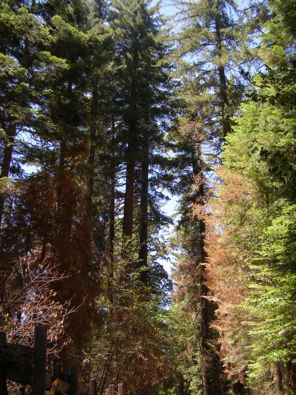 It was a slight (very slight) disappointment, then, when I found that these trees weren't as impressive as the ones I'd seen near Crescent City on the coast on my previous trip, but they are still a great thing to see, and to see how fragile they are in winds - many tops being blown out of the trees - and the way they take their relatively small greenery to the top of the forest to get the sun.