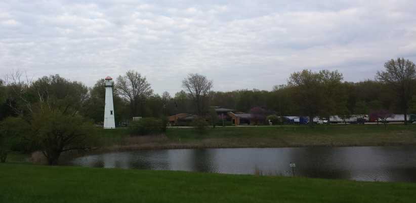 Michigan Welcome Centre. At New Buffalo this ornamental lake and lighthouse pictured the importance of the lakes and lighthouses to this state.