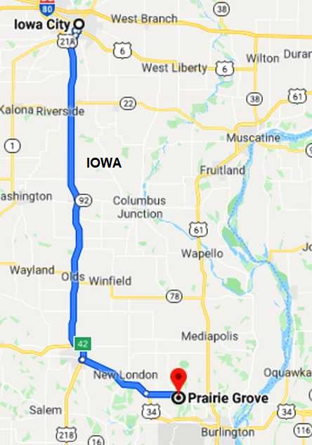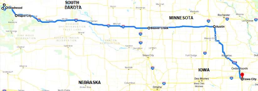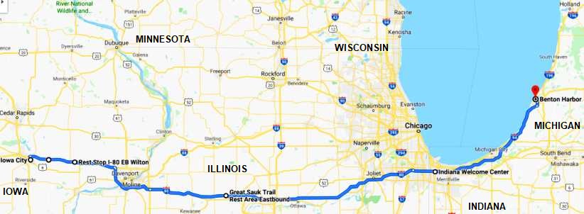 After returning to the motel in Iowa City we packed the van and headed East. This was the path we would follow: