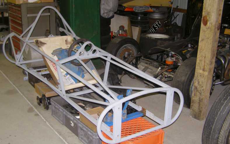 Vee chassis. You wouldn't normally find these things side by side. A Formula Vee chassis and a V8 Sprint Car lurk in the shadows.