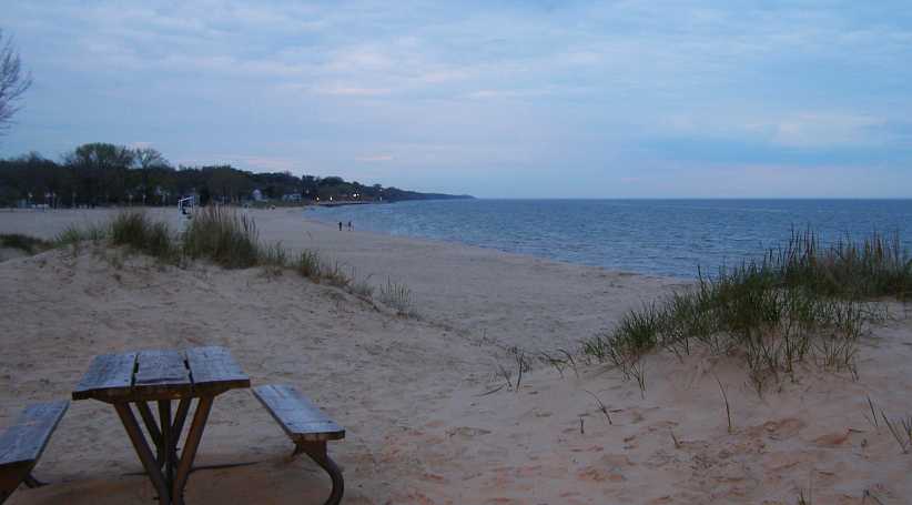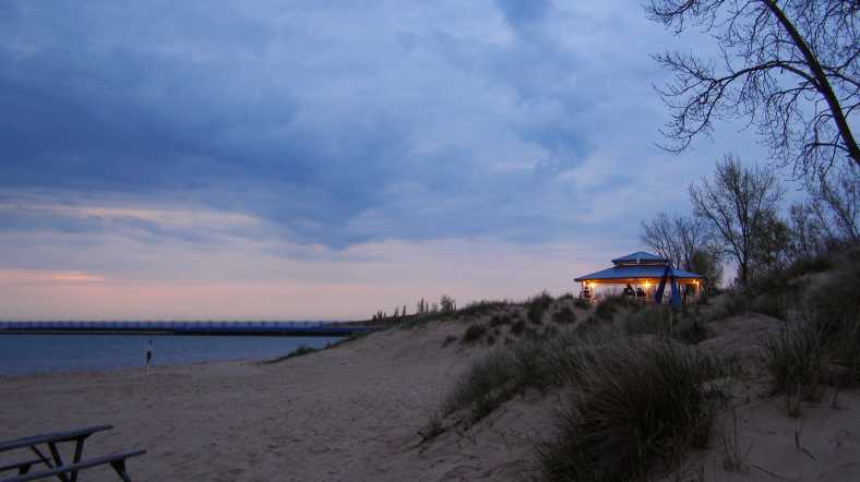 Benton Harbor. We walked along a stretch of the beach and found the harbour inlet as well as the pergola, all lit up. No doubt on a sunny day it’s a very busy recreational area.