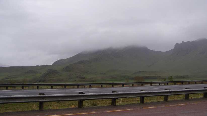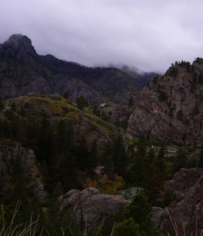 ...on this dreary and otherwise dull overcast day. Well, when it wasn’t spotting us with rain it was merely overcast, anyway, and you can see that low clouds were hanging over some of the rocky outcrops there.