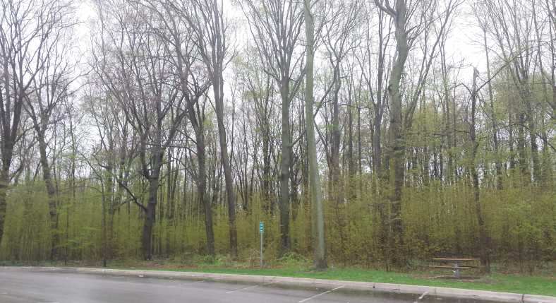 Moist Michigan. Somewhere between Muskegon and Detroit we stopped and Sandra got this picture of the bush and the wet parking area.