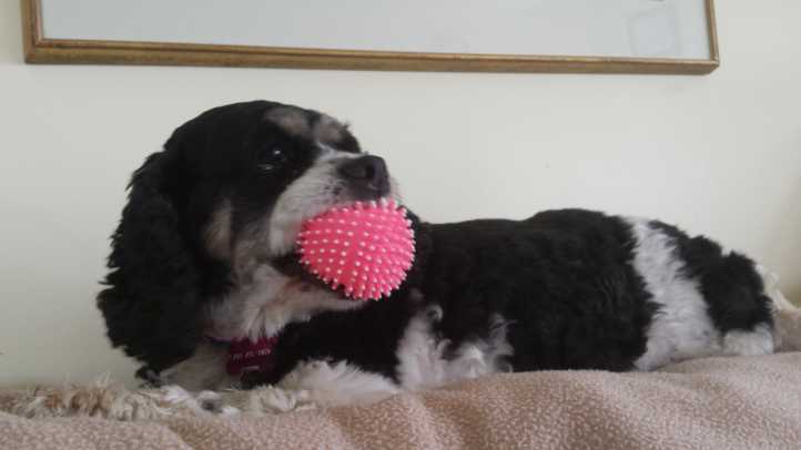 The dog. Jerry and Carmen have had this dog for a long time, but I don’t know how long the pink ball will last!