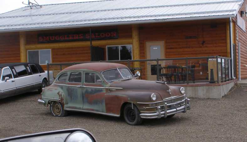 Smugglers Chrysler. I’m also guessing at this, while I know it’s a late forties’ Chrysler, I’m thinking that the reference to smuggling is related to people running booze into the US during the prohibition years.