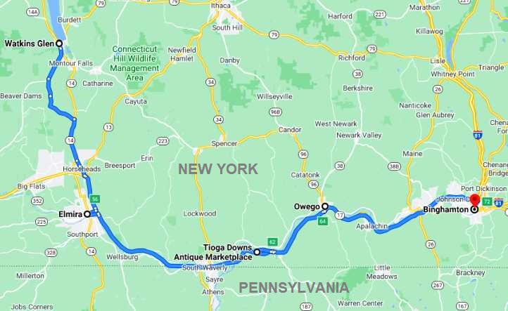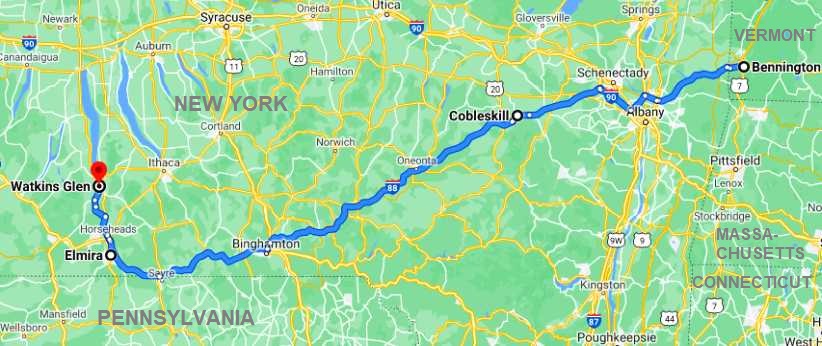 We woke up early and left Salem headed for the long drive to Watkins Glen in New York state, about 400 miles (600kms). Watkins Glen is a big car racing area.