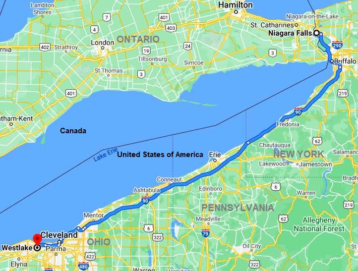 I have just noticed a large body of water to the right of us at a distance. It is Lake Erie, where the water comes from for Niagara Falls. It looks as large as an ocean, that’s what I thought it was when I saw it.