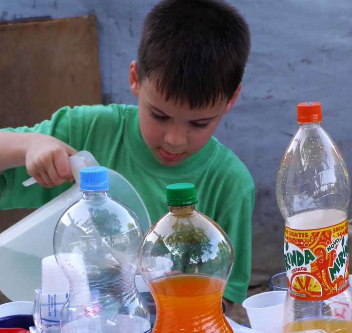 Pouring a drink. One of the youngest of the boys present pours himself a drink between attempts at getting a kick of the ball.