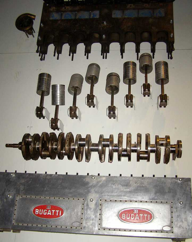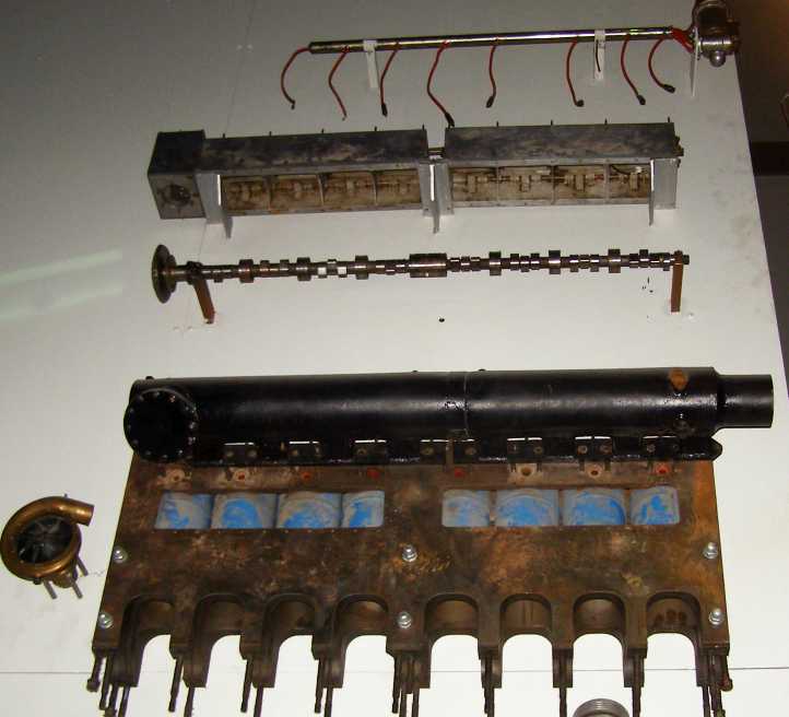 Bottom end. …and this is the lower section, the 9-main bearing crankshaft and the con-rods with four bolts show the big engine was meant to deliver power, the pistons are shown fitted into the sleeves.