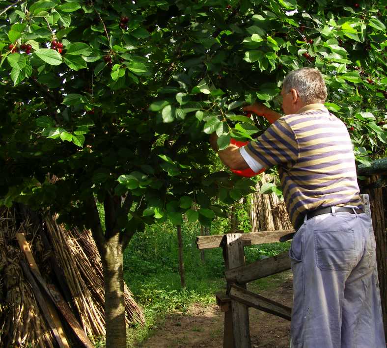 Harvest time. Karl got up the ladder to pick some cherries, he was to give some of them to me to eat as I travelled the next day.