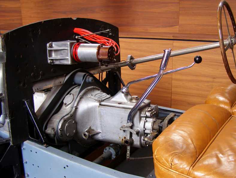 Bugatti gearbox. The gearbox seems a bit large, but it clearly had some work to do. The mount looks interesting, as do the magneto through the firewall and the fabric universal.