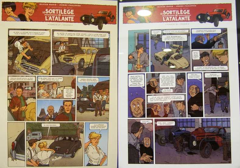 Comic accuracy. Looking at the pages one sees that they’ve been drawn by someone with a full appreciation for cars. Attention to real detail is seen in the clarity of the drawings of the different makes and models, the Peugeot 403 and Jaguar on one page, for instance, the Mercedes 300SL Gullwing and Bugatti on the other. And even under the Peugeot bonnet the detail is correct, the exhaust, the intake, the windscreen washer bottle and the radiator support all being true to real life.