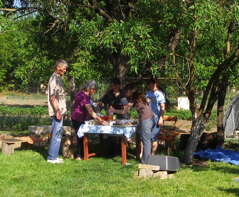 Moving. The table had filled as people arrived and brought more supplies. But the sun was moving too and the decision was taken to move the table back next to the house so it would be in the shade, here they’re preparing it for the transfer.