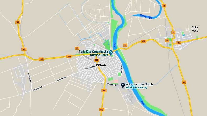 When I’d arrived, Karl had been working on a van which is registered in Austria. He worked for many years in Austria and this was a legacy of that time and it was now due for its annual inspection. A couple of small jobs had to be done, and as he completed one of them I helped him put one of the front wheels back on. After that he was due to meet some of his friends in another part of town… oh, yes, the town. Here’s the local map showing Senta, and across the river is Coka, which comes into the day’s story too: