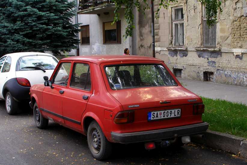 Zastava. A locally-built car made by an armament manufacturer, the car in front of it is a Ford Ka. Some of the buildings here are showing their age.