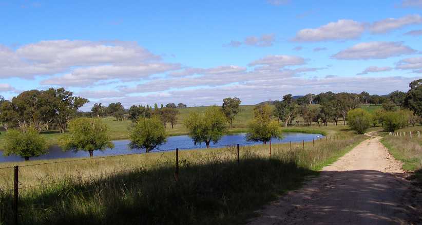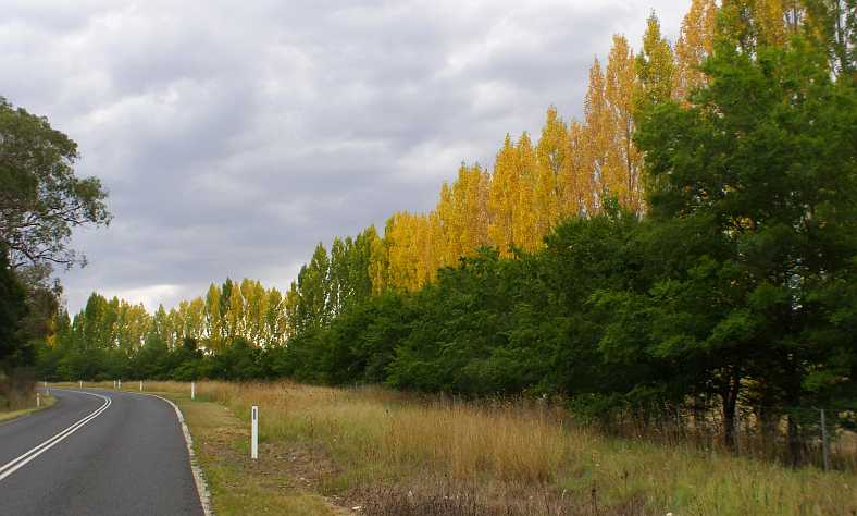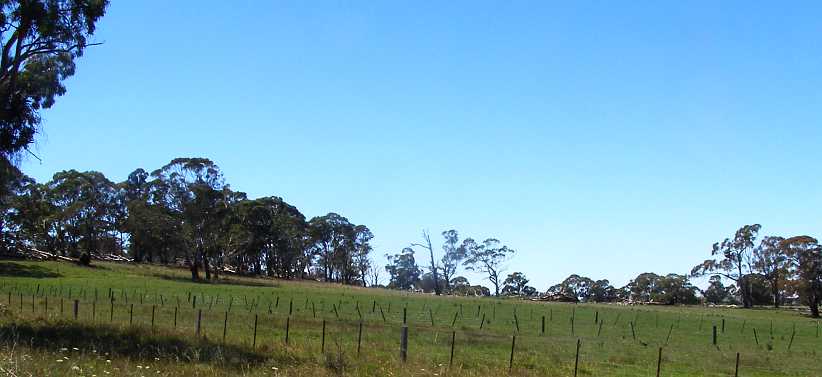 Hills and trees. In the hilly country there tends to be less cleared land and more trees and more of the inevitable scrub. Roads can still be quite straight out here, however.