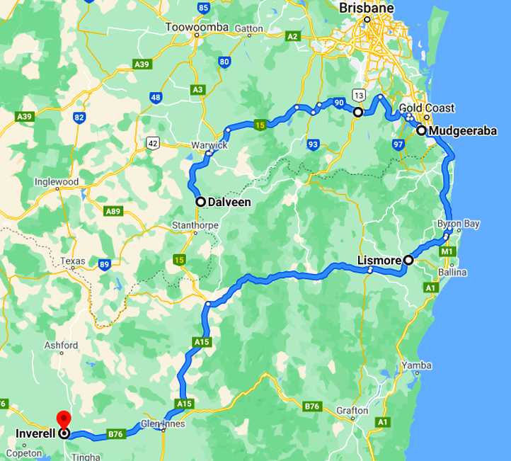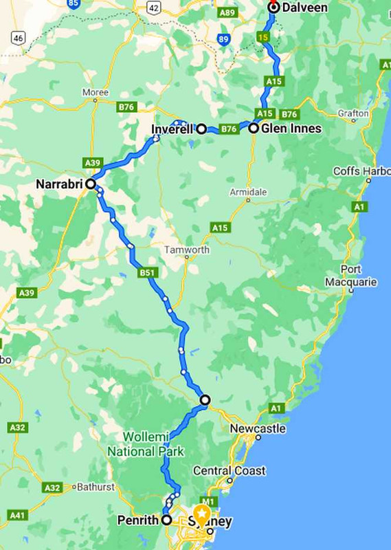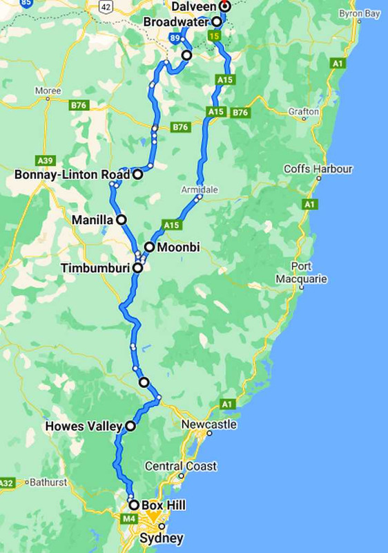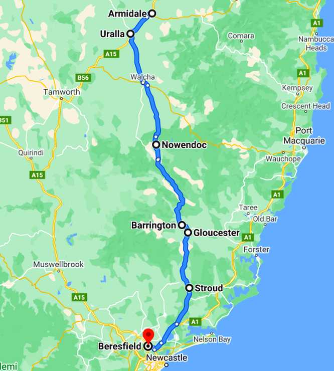Sydney and return. The drive would be straightforward, down the New England Highway to Singleton, with a stopover at Bob Abberfield’s near Tamworth (Timbumburi on the map), then the Putty Road and on to Bob Britton’s, which was just around the corner from where the van was being held.