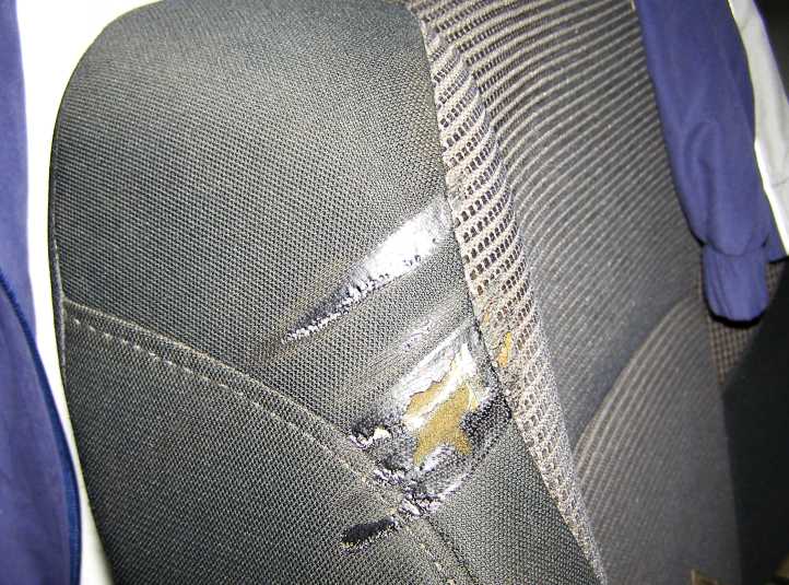 Seat burns. What has caused these burns on the seat? I could not recall anything happening to them. A mystery.