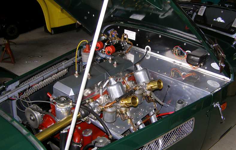 Bob had also truncated the inlet manifold and created a plenum for it which would fit within the lines of the body. Note also that the clutch pedal is in place, while the universal joint in the steering column is just visible in the slot in the firewall as the shaft diverts around the right hand side of the engine: