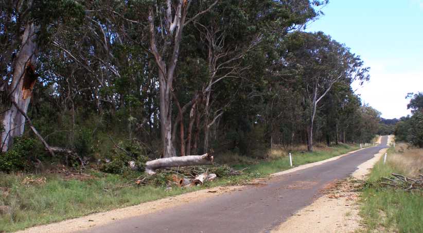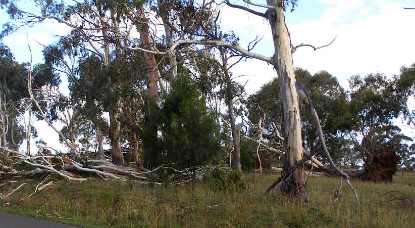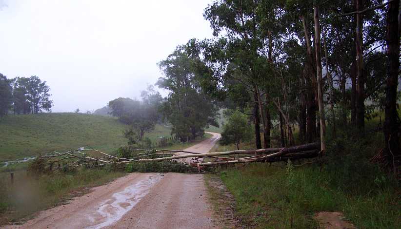 Power lines down. One of the lines brought down by the storm drapes across the main road into the town, the oncoming car’s lights being on due to the storm.