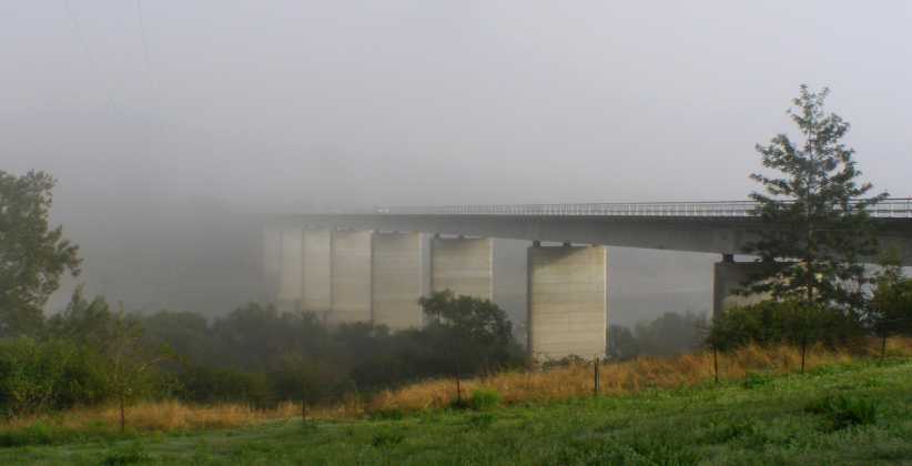 Bridge progress. Work at this stage was mostly underwater, I guess, while this pic shows the sharp turning the road takes on the old bridge to be clear of the railway on the lower deck.