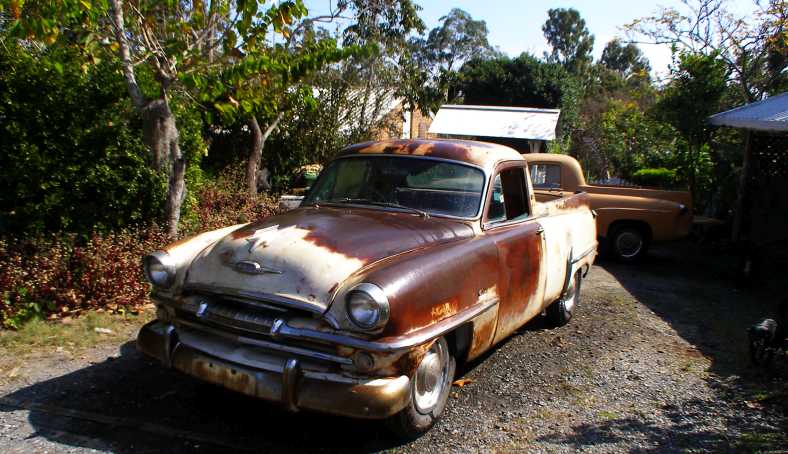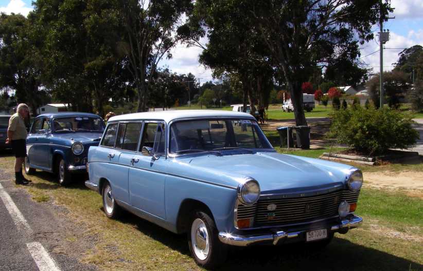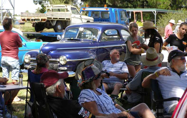 Car show. Members of local car clubs relax in whatever shade they can find on a mid-summer day at Stanthorpe beside the Plymouth and a Holden from 1962-3.