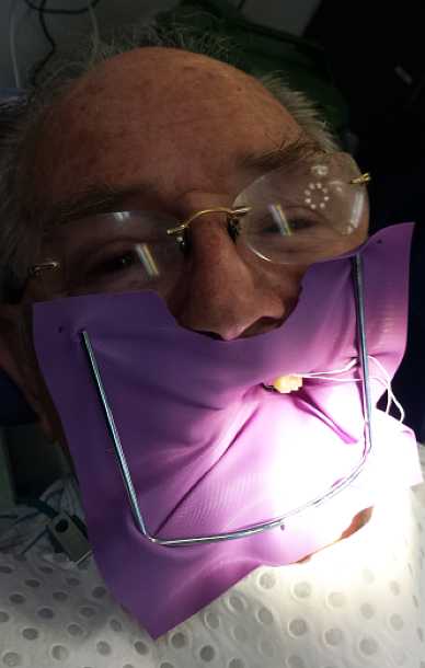 Not my best pose! With the shield in place to prevent too much debris from the drill going into my mouth, I await the students’ attention to the poor tooth.