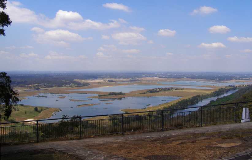 Penrith Lakes. The Hawkesbury Lookout is on a road once used as a hillclimb, the view here is of the Nepean River and the Penrith Lakes.