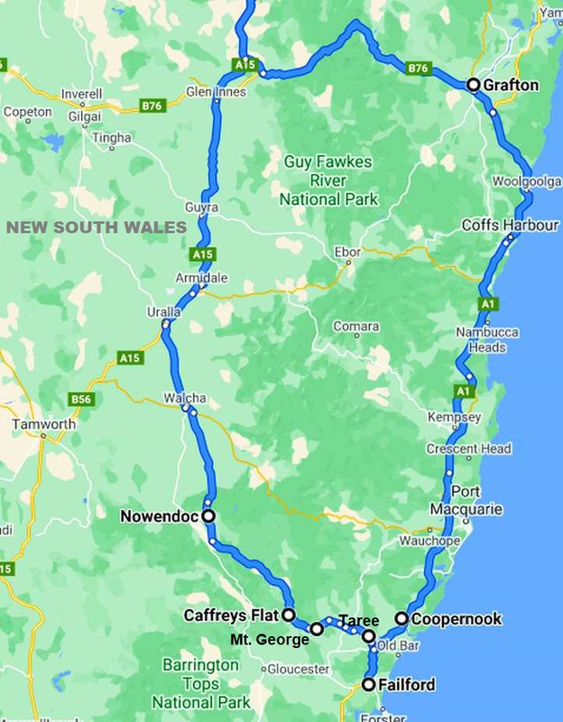 I arranged my work for the coming weekend at Grafton, which would allow me to travel towards home up the coast road and thus visit more people and see different scenery, while the downward trip was via Thunderbolts Way until Nowendoc, then across a much less-used gravel road to Mt George and thence secondary roads into Taree.