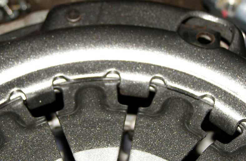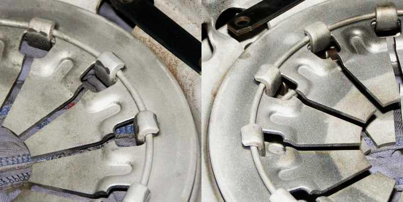 Clutch fix. On the right is the pressure plate as made by Exedy, with the pieces which fold up to locate the fulcrum ring bent through 90 degrees. On the left is Jim’s modification which traps it properly.