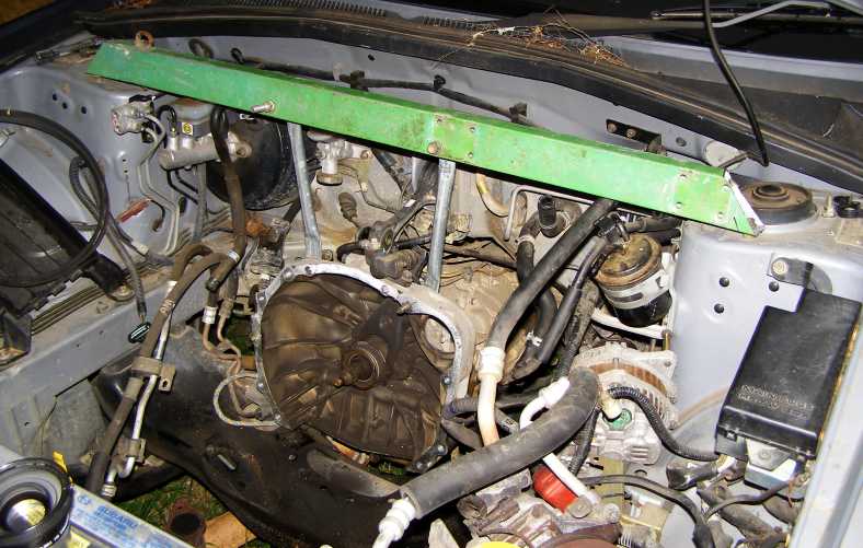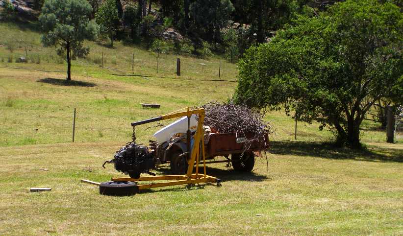 Gearbox lifter. A piece of old rectangular tube from the tip, flatten and drill a couple of pieces of leftover round tube braces from the old satellite dish, a couple of spare bolts and I had the gearbox firmly held in place so the engine would slide onto it easily.