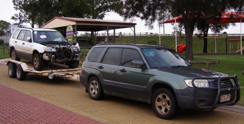 White Forester in transit. After crossing the Great Dividing Range I pulled up at Warwick for a break while towing this home.