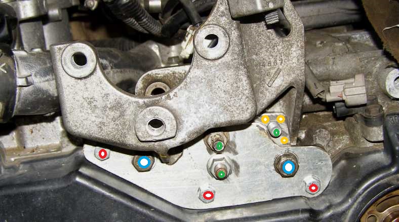 Mount complete. The flat piece held firmly in place by the three 6mm bolts are marked in red, the job of the flat piece is to brace the main bolts so they can’t move under the forces of the belt driving the power-steering pump.