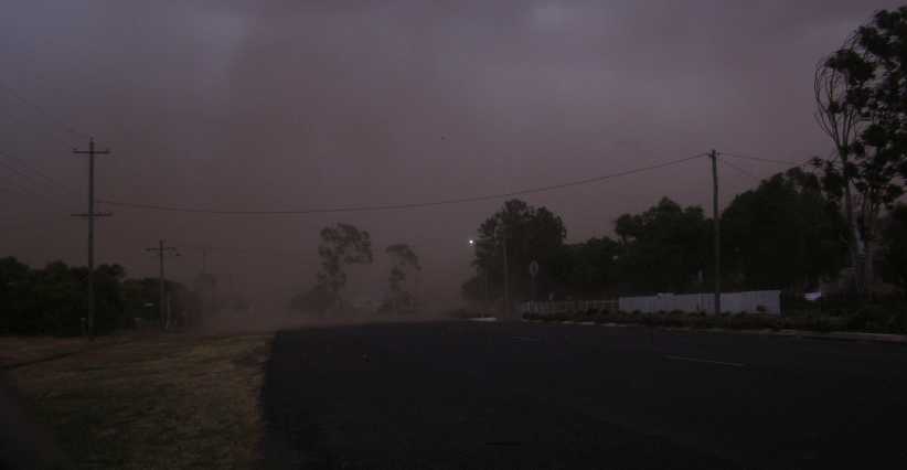 Summer storm. With dark clouds overhead and strong winds whipped up, dust swirled everywhere and power lines whipped about. That’s a spark up there on the right where lines have clashed with each other.