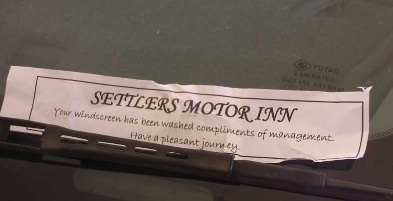 The motel at which I stay in Tenterfield is run by a very helpful couple, this note is on the windscreen of every car when people wake up after a night there: