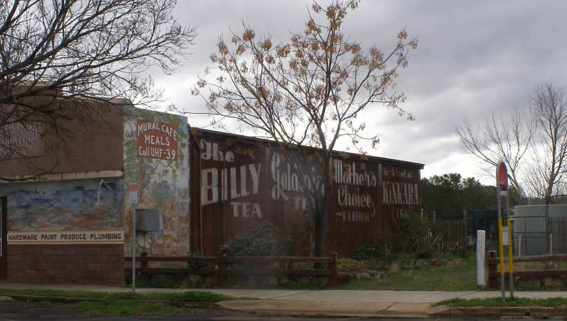 Billy Tea, Goldenia Tea and Kinkara Tea feature here, with the Mother’s Choice Flour being associated with the Kinkara brand. We hear little of any of these today, though Billy Tea, Kinkara and Mother’s Choice still exist. Note that the wall isn’t all history, however, the small cafe sign in the mural section at the front reminds passers-by that they can order over their CB radios.